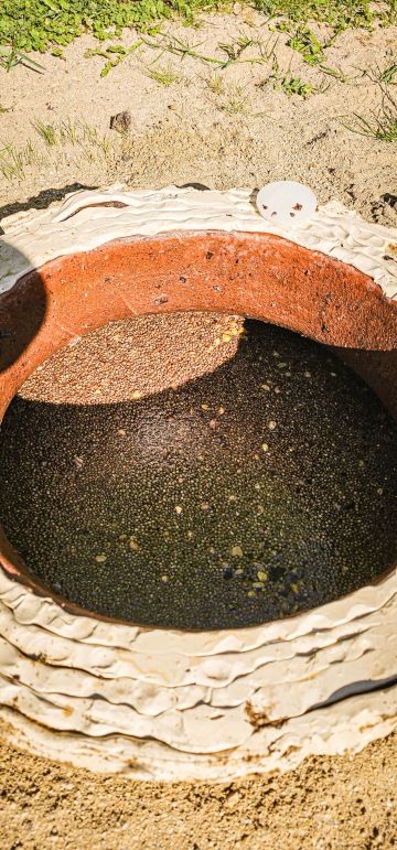 Kvevri se zakopává do země, která udržuje stabilní teplotu po celou dobu kvašení a zrání. Díky tomu víno vzniká zcela přirozeným procesem – bez filtrace, bez chemických zásahů, pouze z hroznů, času a hlíny.