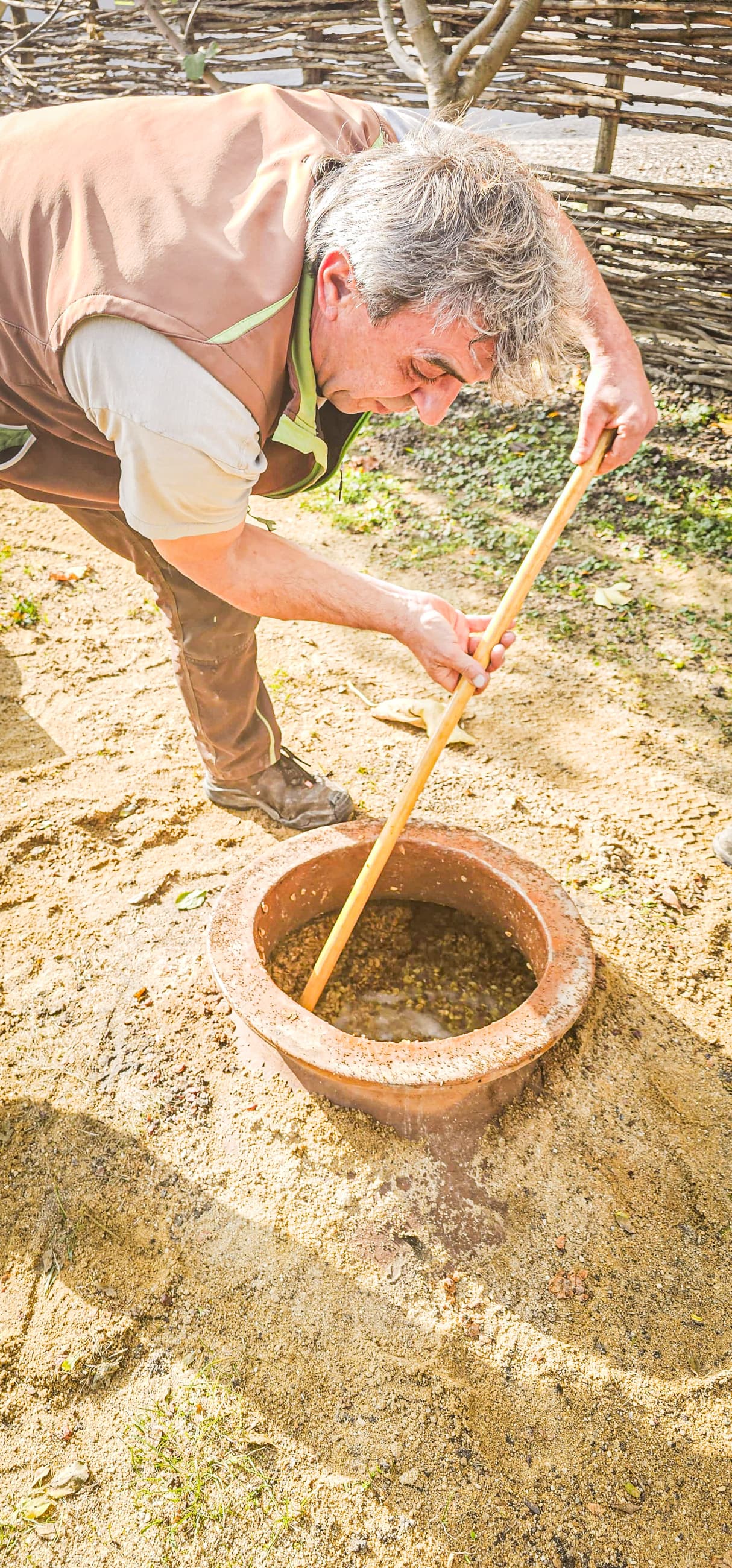 Kvevri se zakopává do země, která udržuje stabilní teplotu po celou dobu kvašení a zrání. Díky tomu víno vzniká zcela přirozeným procesem – bez filtrace, bez chemických zásahů, pouze z hroznů, času a hlíny.